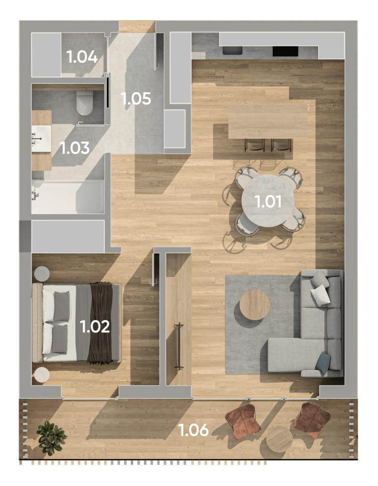 | 1.01 | Living room + kitchen | 30,6 m² |
