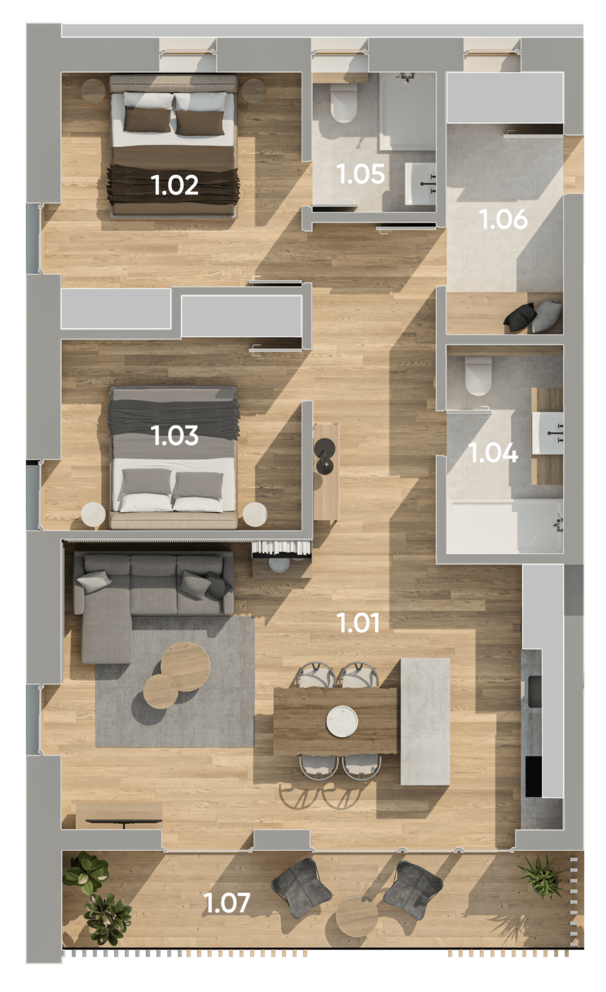 | 1.01 | Living room + kitchen | 28,5 m² |