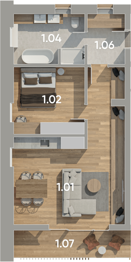 | 1.01 | Living room + kitchen | 25,4 m² |